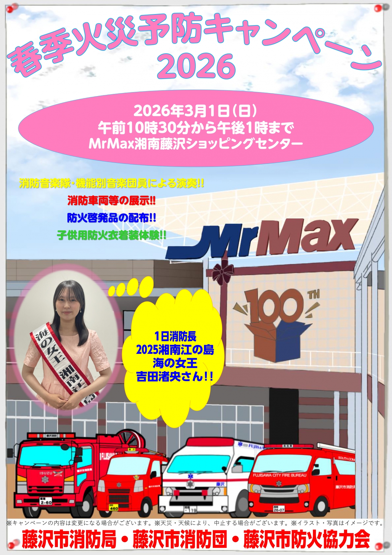 消防音楽隊などによる演奏やはしご車などの消防車両の展示 防火啓発品の配布、子供用防火衣の着装体験など盛りだくさん! 1日消防長として2025湘南江の島海の女王”吉田渚央さん”も参加! 皆様のご来場お待ちしております!